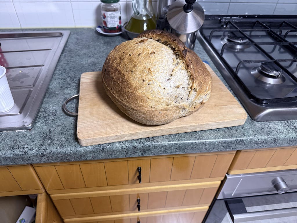 Procedimento: In una ciotola, impastare tutti gli ingredienti per 10 minuti circa, fino ad ottenere un impasto liscio ed omogeneo. Lasciare l’impasto a riposare per 10 minuti coperto con un telo e formare una pagnotta. Far riposare la pagnotta per 150-180 minuti su una teglia foderata con carta forno all’interno del forno spento. Estrarre la teglia, portare il forno a 220°C e infornare per 20-25 minuti.
